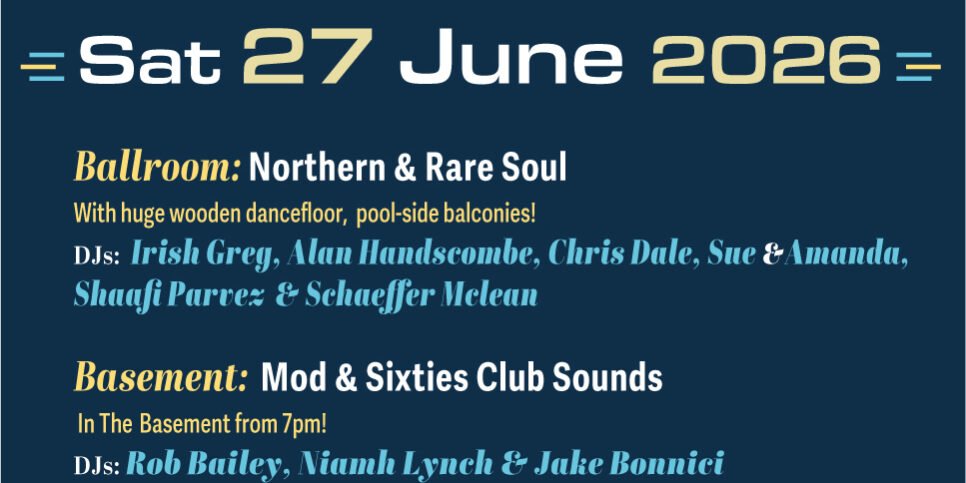 Ballroom: Northern & Rare Soul with huge wooden dancefloor, balconies over the pool & DJ’s Irish Greg, Alan Handscombe, Chris Dale, The Soul Sisters- Amanda & Sue, Shaafi Parvez (Heart Of Soul) & Schaeffer Mclean (Bristol Northern Soul Club)
